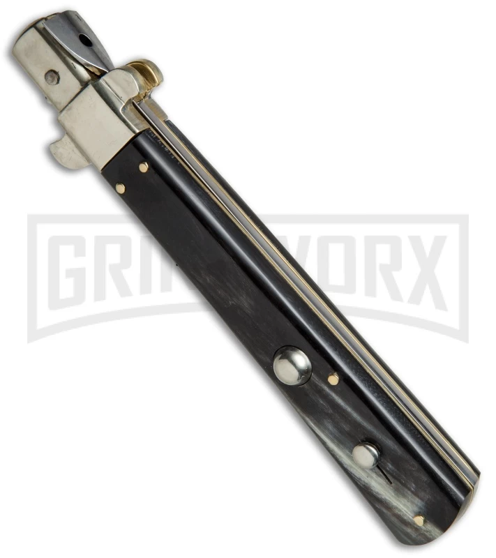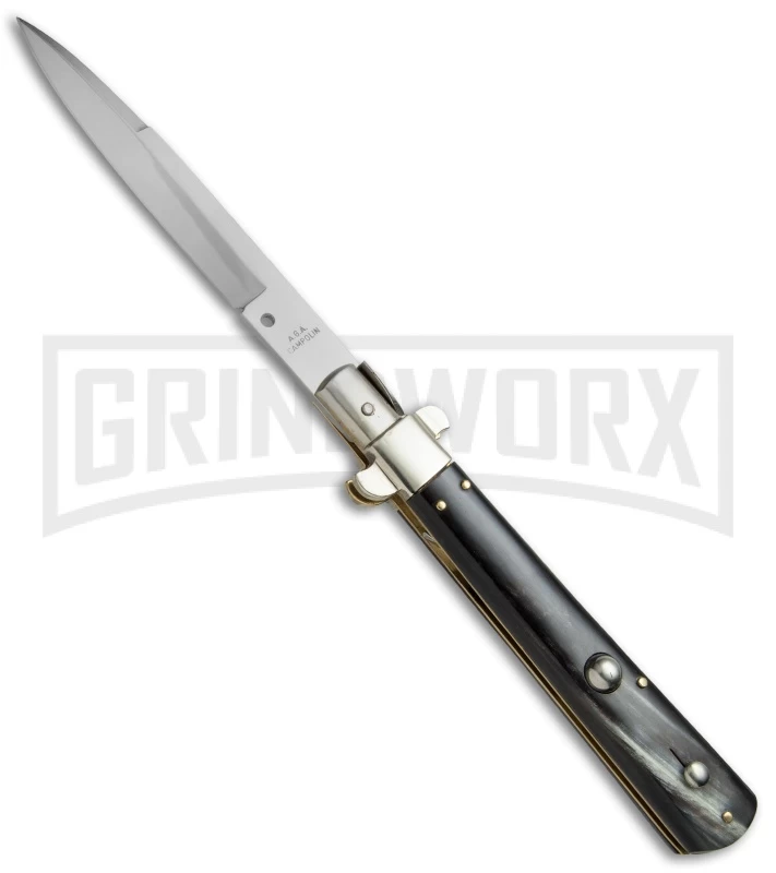 This beautiful knife features an AISI 420 stainless steel bayonet blade with a flared bolster lock on the spine. The push button release gives smooth and quick action, and there is a sliding safety button to guard against accidentally opening the blade. This knife is one of 80 made in this style by A.G.A. Campolin.