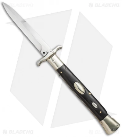 This Italian Stiletto from A.G.A. Campolin comes in the Bat Swinguard style with an ebony horn handle and a dagger blade. A.G.A. Campolin offers some of the finest traditional Italian Stiletto’s on the market, with a variety of collectible styles to choose from. This Bat Swinguard model has an ebony horn handle with nickel silver bolsters and buttons. Brass pins and liners add a classic touch to the design. The blade comes in a bayonet style with a plain edge and a polished finish. Add a piece of Italian history to your collection with the A.G.A. Campolin 13″ Swinguard Stiletto.