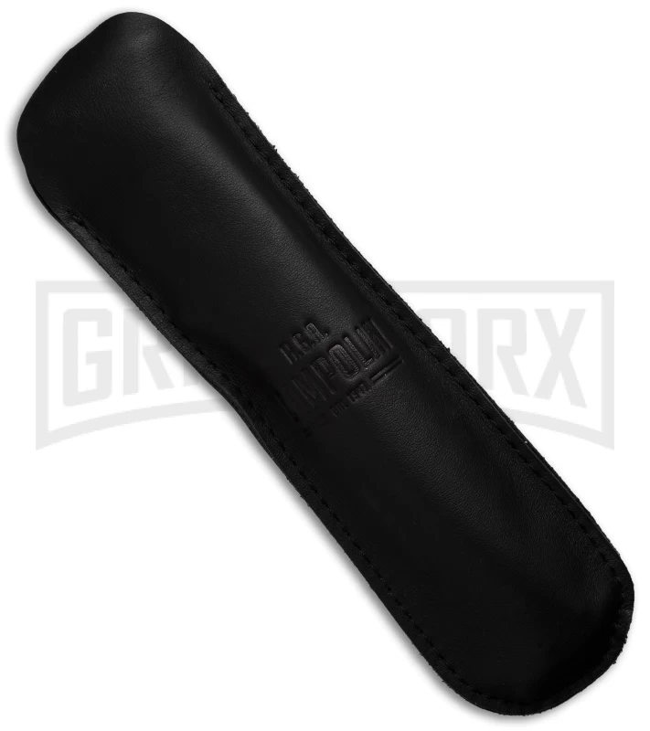 An impressive interpretation of the classic swinguard from AGA Campoloin. This knife measures 13 inches when opened and has a stylized swinguard. It features a polished stainless steel dagger blade and a brass shield-shaped firing button. The rich stag handles are offset with brass pins over brass liners. The blade has fast, smooth action in spite of its size. The unique swinguard design gives the knife an almost medieval look. Includes a soft leather storage pouch.