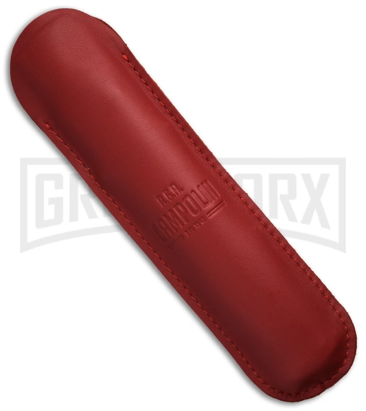 An impressive interpretation of the classic swinguard from AGA Campoloin. This knife measures 13 inches when opened and has a stylized swinguard. It features a polished stainless steel dagger blade and a brass firing button. Rich ebony wood handles are offset with brass pins over brass liners. The blade has fast, smooth action in spite of its size. The unique swinguard design gives the knife an almost medieval look. Includes a soft leather storage pouch.