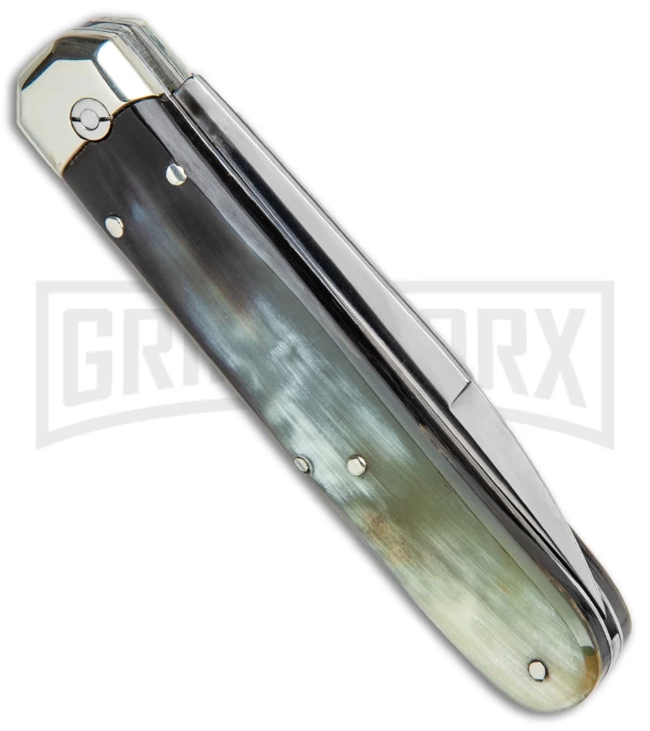 Offering an elegant and collectible design, this AGA Campolin Baron is a one of a kind piece worthy of any Italian collection. It features a fine stainless steel bayonet blade with an “A.G.A. Campolin” collector stamp on the tang. The authentic dark horn scales add a touch of tradition to this knife, as do the stainless bolsters, liners, and pins.
