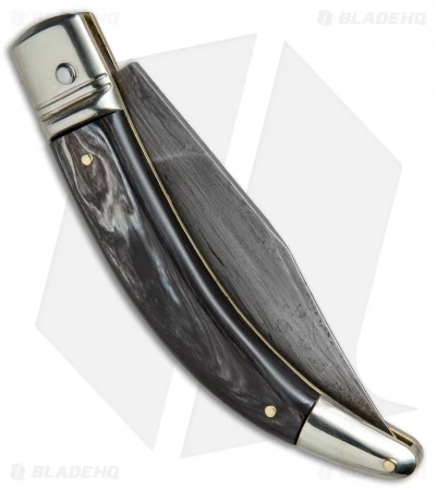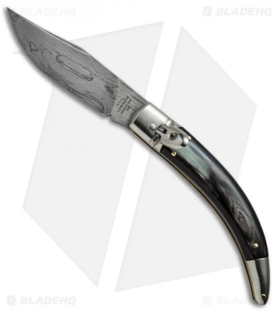 This Italian Stiletto from A.G.A. Campolin comes in the Diana Leverlock style with a dark horn handle and a Damascus steel blade. A.G.A. Campolin offers some of the finest traditional Italian Stiletto’s on the market, with a variety of collectible styles to choose from. Brass pins and liners add a classic touch to the design. Add a piece of Italian history to your collection with the A.G.A. Campolin Diana Leverlock Stiletto.