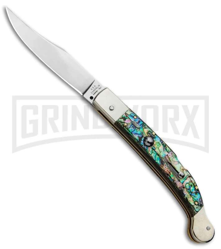 This beautiful 9″ AGA Campolin Sahara Stiletto features a stainless steel clip point blade with polished nickel silver bolsters. The abalone scales are offset with brass pins over brass liners. The nickel silver round push button and sliding safety give this stiletto even more class. This knife shows the highest quality workmanship and will make an elegant addition to your Italian collection.