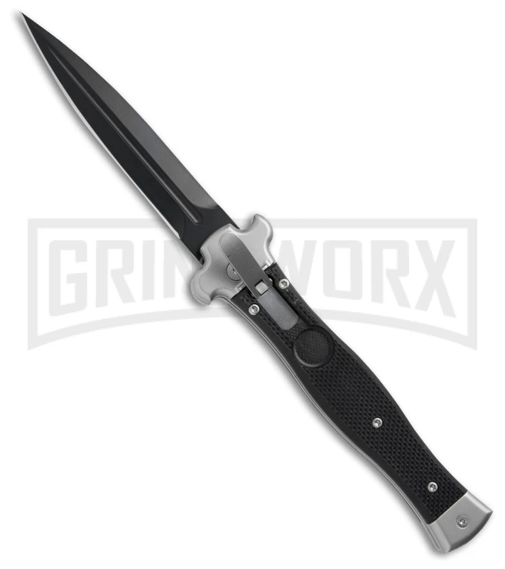 This Zero Italian automatic sports a black G-10 handle and a black finished dagger blade. The AGA Campolin Zero features a fully automatic leverlock design. It has a stainless steel bolstered handle with grippy textured G-10 handle scales.